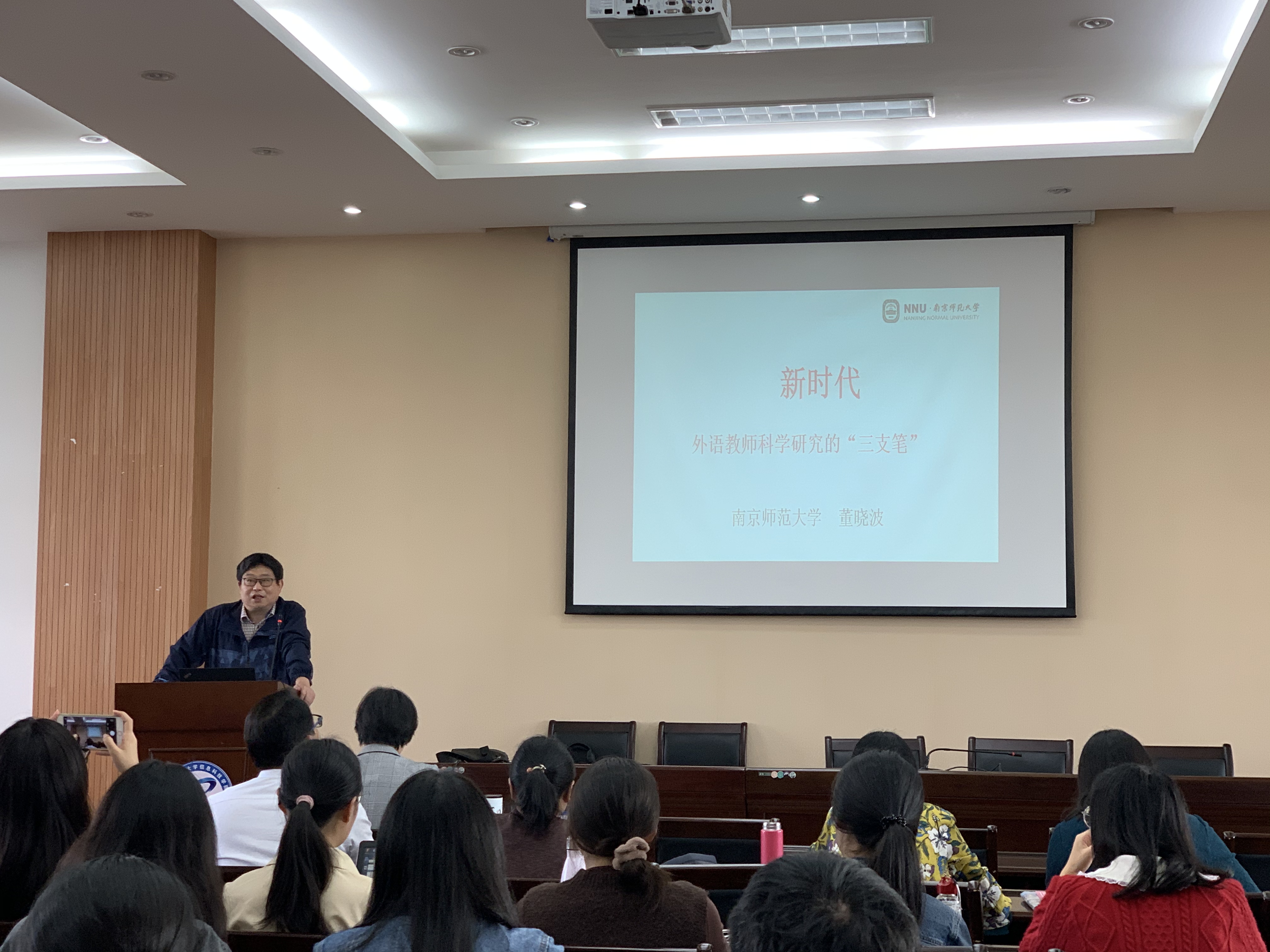 讲座伊始,董晓波指出,随着中国特色社会主义进入新时代,外语教师要有新的责任担当。正如习近平总书记在“哲学社会科学工作座谈会”中讲的那样,教师应该树立为人民做学问的理想,自觉把个人追求同国家和民族发展紧紧联系在一起。为了实现这一目标,新时代的外语教师做科研要用好“三支笔”:一是做强“学术研究”,外语教师要有“十年磨一剑”的胸怀;二是做优“理论阐释”,强调研究成果要发挥引领社会共识,汇聚精神动能的作用;三是做实“咨询决策”,要求研究者们立足新时代,投身中国特色社会主义伟大事业。