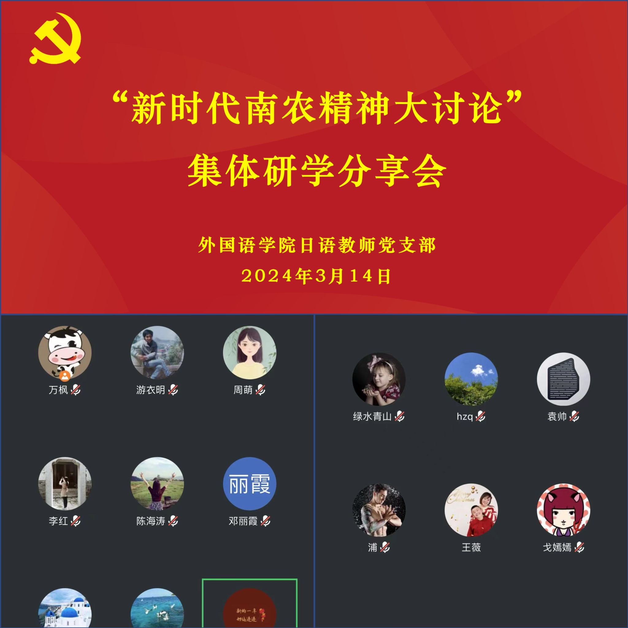 日语系教师党支部线上召开“新时代南农精神”大讨论第一阶段集中研讨会暨本科生教学评估迎评准备会。日语系全体教师参加,日语系教师党支部副书记曹娟主持讨论会。