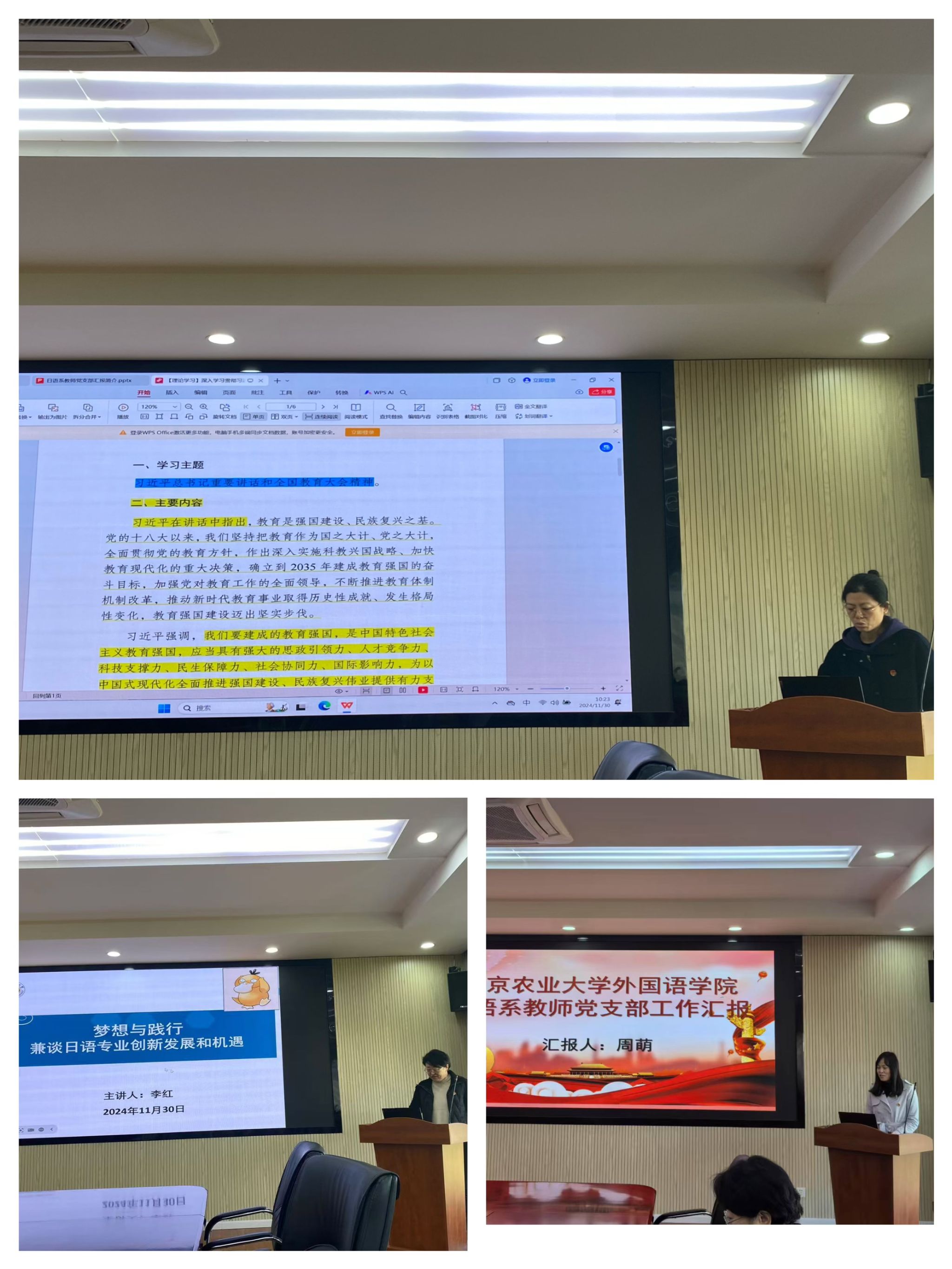 日语系教师党支部书记周萌也分享了支部的基本情况及支部近年来开展的一系列特色党日活动,总结了近年来开展党建工作的新思路、新举措,强调了党支部在推动教育教学改革、促进师生思想政治素质提升方面的重要作用。