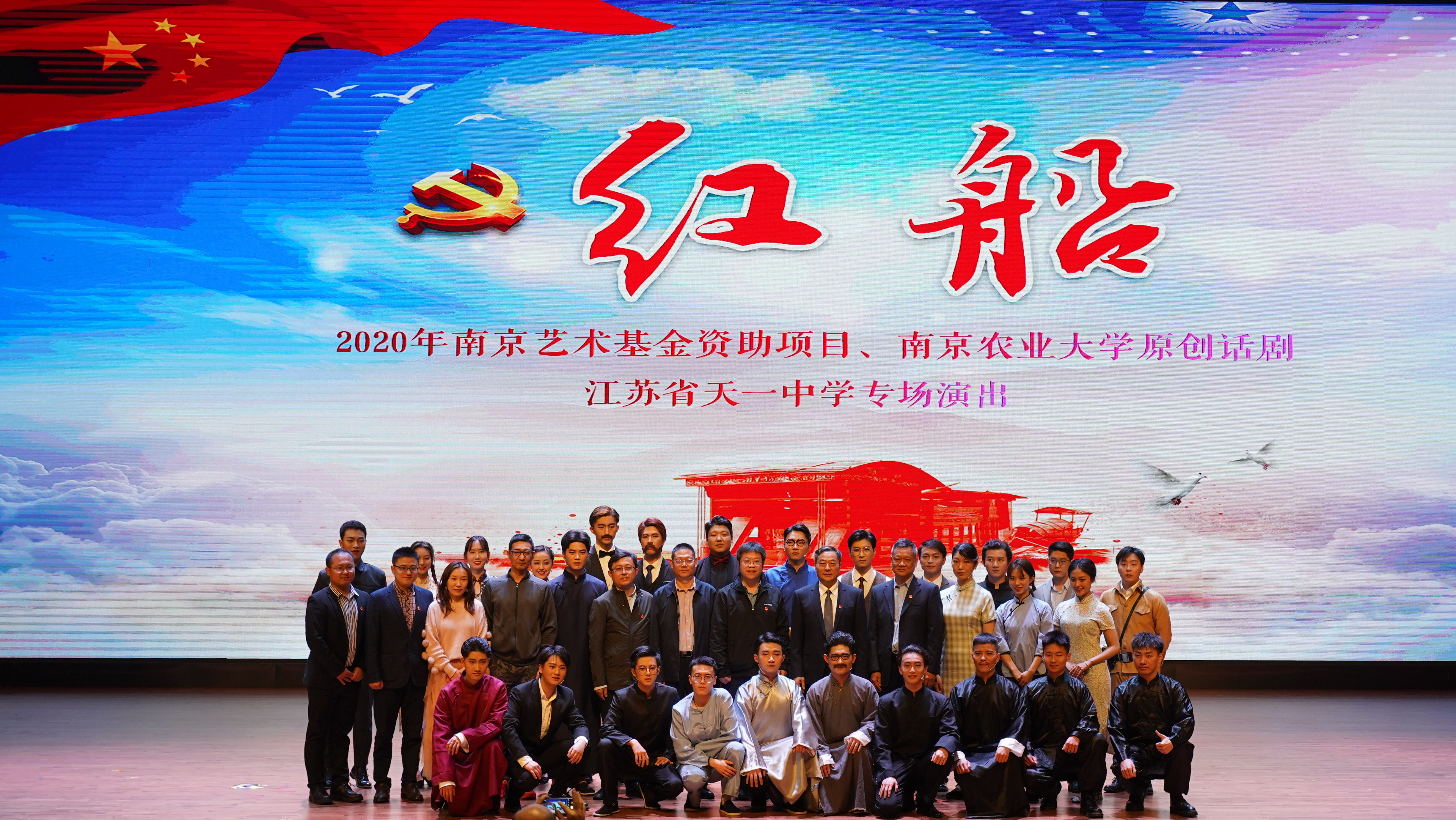 话剧《红船》为2020年南京艺术基金资助项目,由我校师生自编、自导、自演,以“一叶红船承载的红色基因”为线索,重现了毛泽东、董必武等13位一大代表创立中国共产党的光荣历程和辗转波折,再现了建党的恢宏时刻,讴歌了早期共产党人开天辟地、敢为人先的首创精神,坚定理想、百折不挠的奋斗精神,立党为公、忠诚为民的奉献精神,谱写了一部“弘扬‘红船精神’、传承初心使命”的时代赞歌。演出跌宕起伏,引人入胜,引发了现场师生阵阵掌声。展演在全体演职人员们同唱《没有共产党就没有新中国》的铿锵歌声中顺利结束。