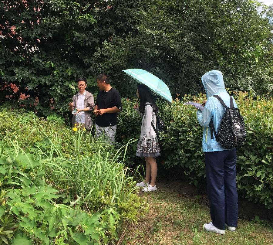 座谈结束后,招生宣传组在钱敏艳带领下,对锡山高级中学校园中的植物、树种进行了辨认和考察。在前期整理的校园树种清单的基础上,园艺学院管志勇副教授充分利用园艺专业知识,对校园内常见的树种学名进行了更正,同时对罕见树种进行确认和记录工作。