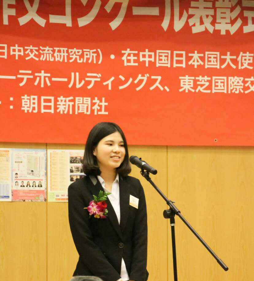 日语系学生张彩玲、蒋易珈分别荣获一等奖和三等奖。此外,日语系教师石原美和获得优秀指导教师奖。张彩玲同学作为学生代表在颁奖仪式上做了发言,发表了自己的获奖作文及获奖感言。当天日本驻华大使横井裕也莅临颁奖仪式并为获奖选手颁奖。