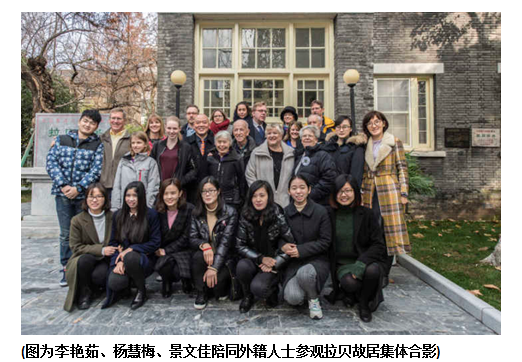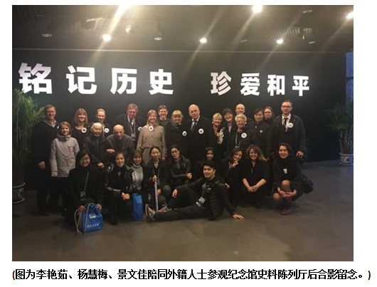 本次实习工作重头戏也就是第二阶段为2016年11月23日至2016年12月16日。杨慧梅、李艳茹、景文佳三位同学全程参与了2016年国家公祭日的准备与接待工作。本次国家公祭活动除了在活动规格、国家领导重视程度与之前两次一致外,在参与活动人员安排上,首次邀请了南京大屠杀期间志愿留守南京救助保护25万难民、成立“南京安全区国际委员会”欧美人士的后裔参加公祭活动,他们包括安全区国际委员会主席约翰·拉贝的孙子托马斯·拉贝夫妇;冒死将记录南京大屠杀的影像胶卷送出重围的乔治·费奇的小儿子罗伯特·费奇夫妇;救死扶伤的威尔逊医生的孙子和孙女们罗伯特·威尔逊、伊丽莎白·威尔逊以及马乔里·威尔逊;美籍医生特里默的孙子莫里斯·特里默夫妇;美籍医生理查德·布兰迪医生的孙子斯蒂芬·布兰迪一家以及大屠杀期间最早冒生命危险回到南京维护正义的德国外交官乔治·罗森博士的弗里德里希·罗森等一共6个家庭共计18人。在公祭活动准备前期,三位同学勤勤恳恳,任劳任怨,参与了包括接待方案制定、活动日程表拟定、会晤手册翻译、外籍人士信息采集并与其对接沟通等事项,为外籍人士顺利赴宁参加公祭活动做好充分工作。活动期间,全程陪同各组外籍家庭人员参与12月12日在钟山宾馆举行的“紫金草国际和平纪念章”颁发仪式和《南京不会忘记》新书发布会,并协助江苏电视台对外籍人士进行采访。