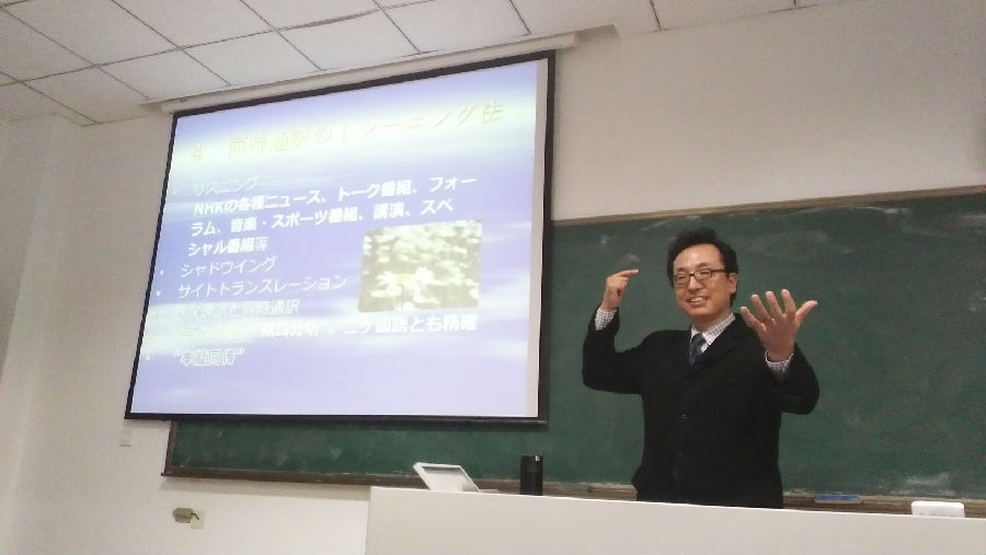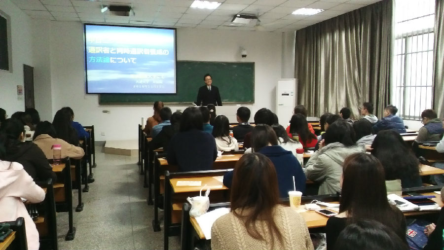 作学术报告,为师生们带来了一场别开生面的专题讲座。讲座题为「中日二ヶ国語間の通訳者と同時通訳者養成の方法論について」,聆听此次讲座的有外语学院大三、大四学生、研究生及部分教师。
