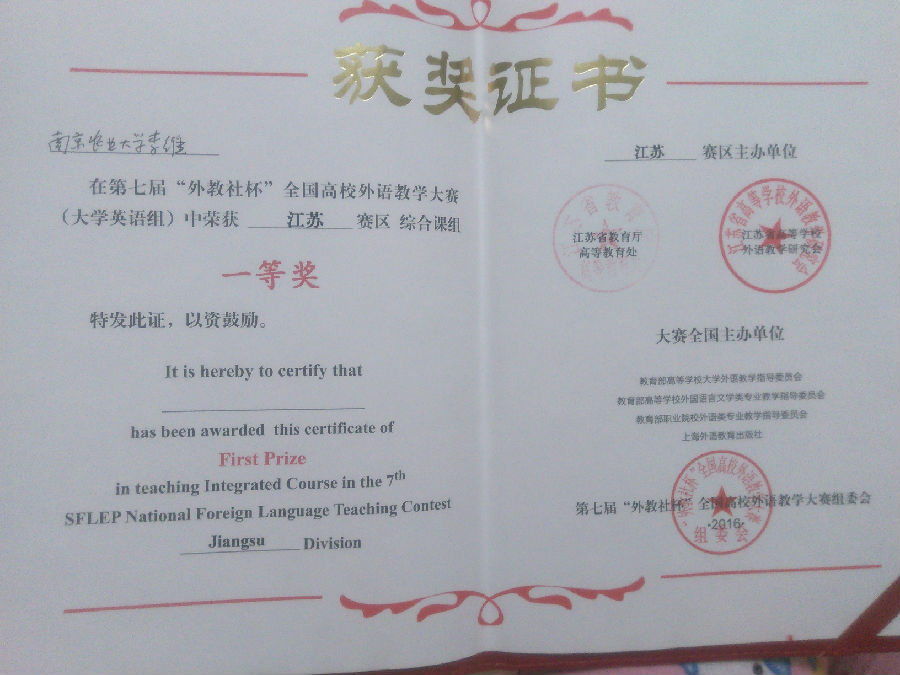 5月29日,由江苏省教育厅高等教育处、江苏省高等学校外语教学研究会和上海外语教育出版社联合举办的第七届“外教社”杯全国高校外语教学大赛在扬州大学落幕。我校草榴社区 的李维老师通过初赛、复赛最后进入决赛。在决赛中与其他十一位来自全省其它高校的优秀教师同场竞技。比赛包括现场授课、即兴说课以及现场提问等环节,李维老师在比赛中展现了强劲的实力,最后荣获综合组一等奖,充分展示了我校老师较高的外语教学水平。