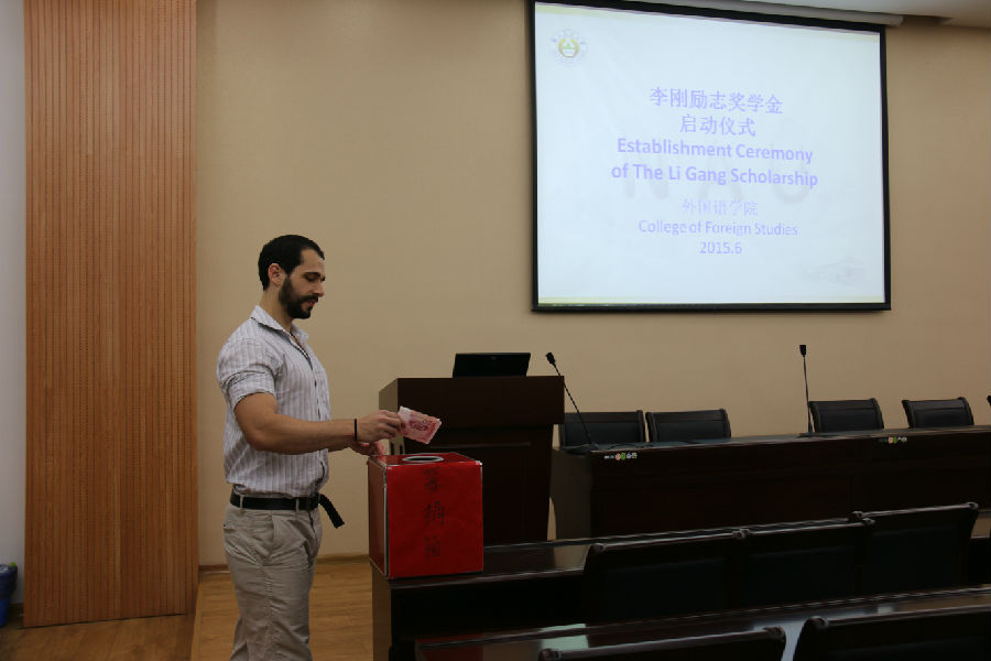 最后,大会启动了现场募捐,在座的各位师生,包括5名外教纷纷表达了自己的爱心。共筹得善款一万元整。Taubenfeld先生表示,他将此奖学金的设立告知其美国的亲朋好友,争取捐赠,让更多的南农学子传承李刚精神。