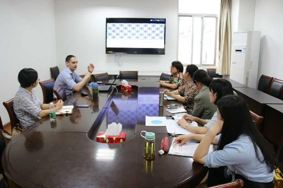 举办的“写作工作坊”的最后一次。外教James Luke Hadley博士,曹新宇副院长以及学院其他中青年教师参加了本次讨论会。