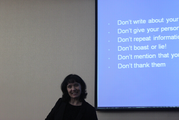 在主持人进行简短的开场白之后,两位来自英国的招生官、圣安德鲁斯大学(University of St Andrews)的副院长和教学总监Lesley Thirkell女士和赫尔大学(University of Hull)的校友Gerson Pei先生分别进行了宣讲。