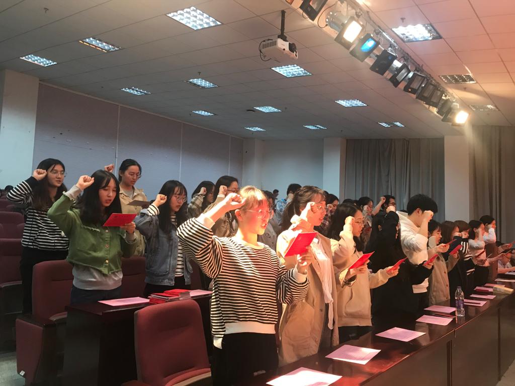 典礼在庄严肃穆的《国际歌》中正式开始。首先,由新发展党员代表吴靖发言。她以自己的入党经历为切入点,指出党员是责任、信仰与先进性的代表,认为党员应积极发挥先锋模范作用,从思想和行动上引领青年。随后,马克思主义学院党员代表杨浩发言。他讲述了自己入党后,个人的成长和带领所在集体不断修炼的经历,强调“组织上入党一生一次,思想上入党是一辈子的事”,鼓励新发展学生党员要提高个人政治素质和理论水平,严守党章和纪律,成为经得起考验的党的接班人。接下来,在新发展党员刘艳秋同志的带领下,全体新发展党员面对党旗重温入党誓词。之后,党建班副班长朱江霖对2017-2018学年学生党建工作进行了总结,并对党建班的下一步工作部署进行合理展望。