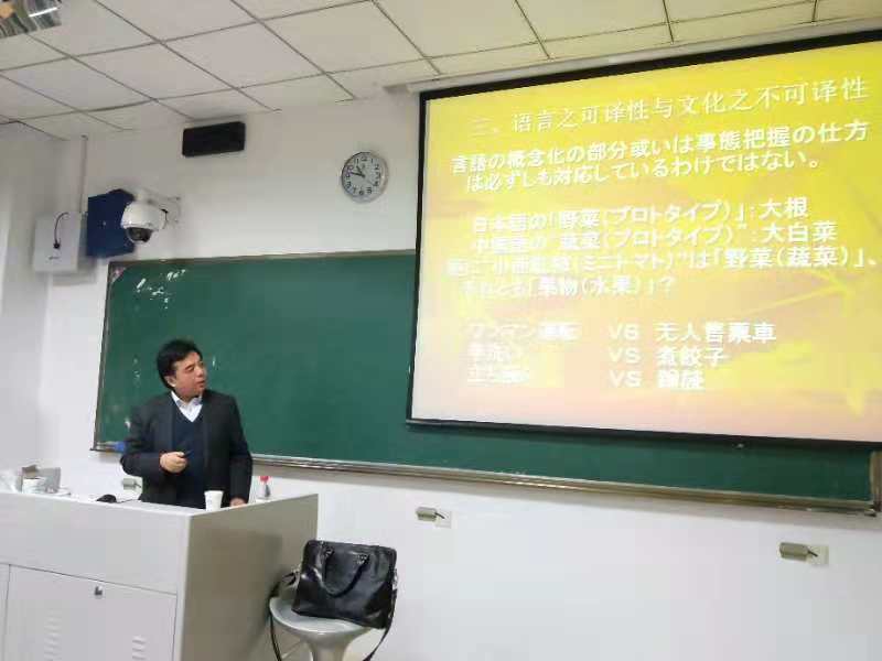 徐一平教授首先用“翻译有无绝对答案”这一疑问的方式开始了讲座。徐教授用简单的一句日语自我介绍为例,讲解了不同身份、背景、语气、心情下的多种中文翻译,诠释了“翻译没有绝对答案”。徐教授又指出,虽然翻译没有绝对答案,但是翻译有评判其好坏的标准。他紧接着为同学们介绍了严复、钱钟书、傅雷等翻译大家的翻译理念,提醒大家好的翻译要忠实于原文,但并不是要亦步亦趋、矫揉造作,而是在对原作融会贯通的前提下,通过自己的审美判断和选择,对原作进行艺术再创造,因此,他将翻译形象地比喻成“带着镣铐舞蹈”。