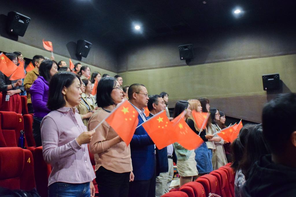 影片结尾,全体师生起立,跟随歌曲《我和我的祖国》,挥动国旗,齐声合唱,现场气氛达到了高潮。