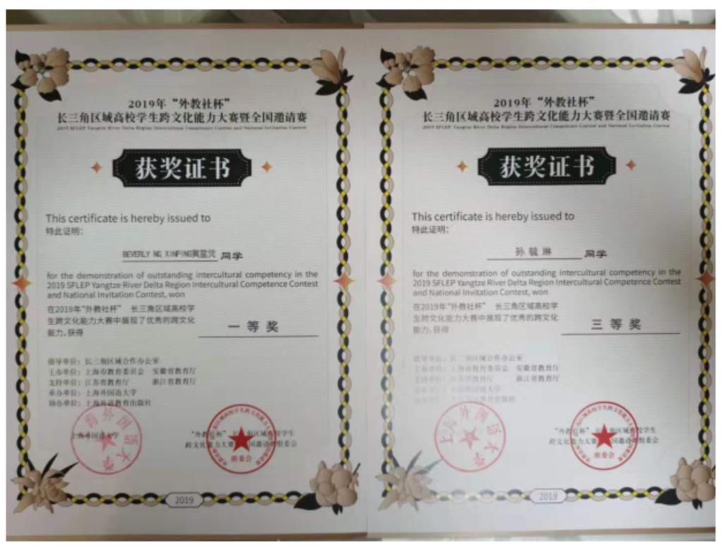本次大赛共有 200 多所高校参加,选出 17 支队伍赴上海外教社参加总决赛。我校学生黄星凭(BEVERLY NG XINPING)和孙毓琳入选江苏省代表队。通过两天激烈的角逐,两名选手在跨文化案例展示和现场问答环节表现优秀进入总决赛。总决赛分为三个环节,跨文化知识快问快答、情景评述、讲述中国故事,留学生黄星凭(BEVERLY NG XINPING)获得总决赛一等奖和特别贡献奖,孙毓琳同学获得三等奖,两位同学赢得了专家评委们的一致认可;外语学院苏瑜、王婷和徐红芳三位老师获得优秀指导奖。