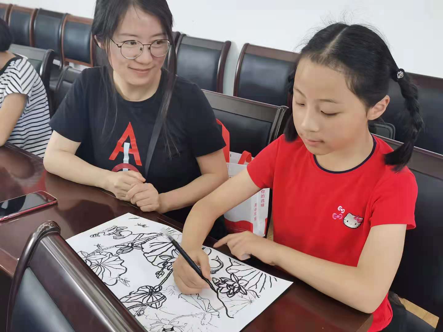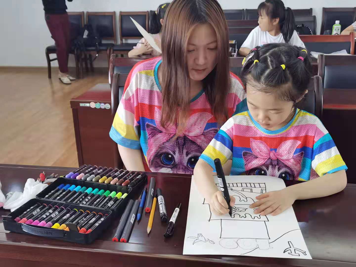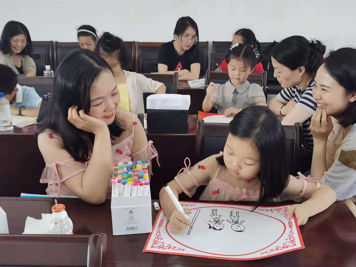 活动以亲子现场共同作画的形式展开,来自学院的教师和孩子们共同构思作画,现场气氛热烈。孩子们的作品构思精巧,充满想象力,用手中的画笔描绘出心中的美好家园和幸福生活。《南昌起义打响的第一枪》、《巨龙腾飞》、《不忘初心,牢记使命》、《鱼戏莲叶图》,一幅幅生动的画作诠释了不忘历史、国力昌盛、民族富强、人民幸福的场景,也寄予了老师和孩子们的美好愿望。
