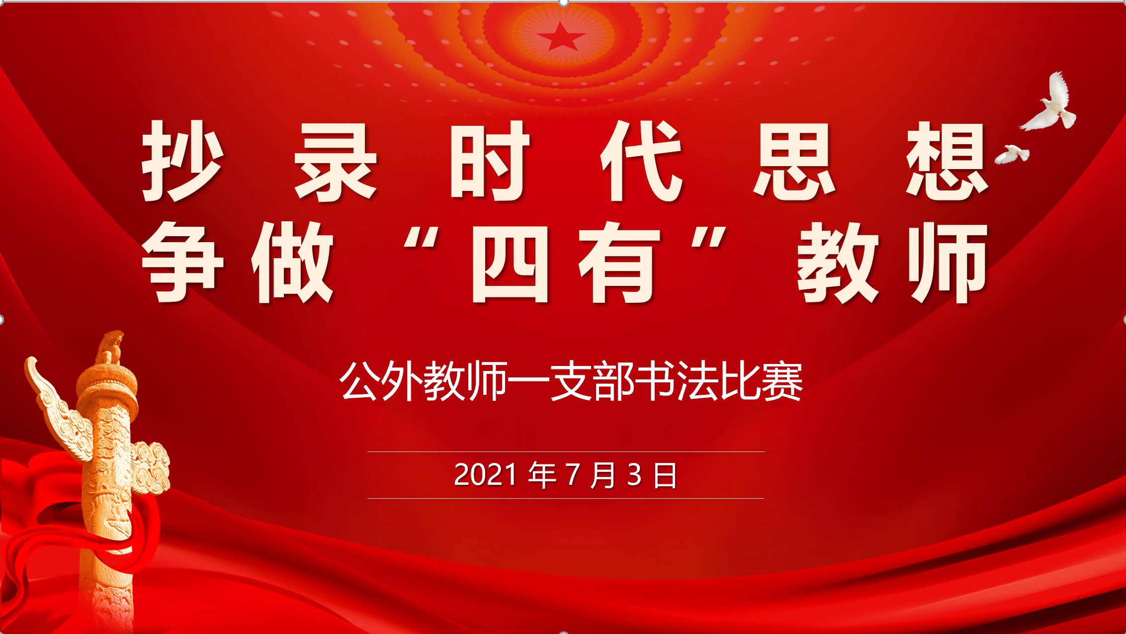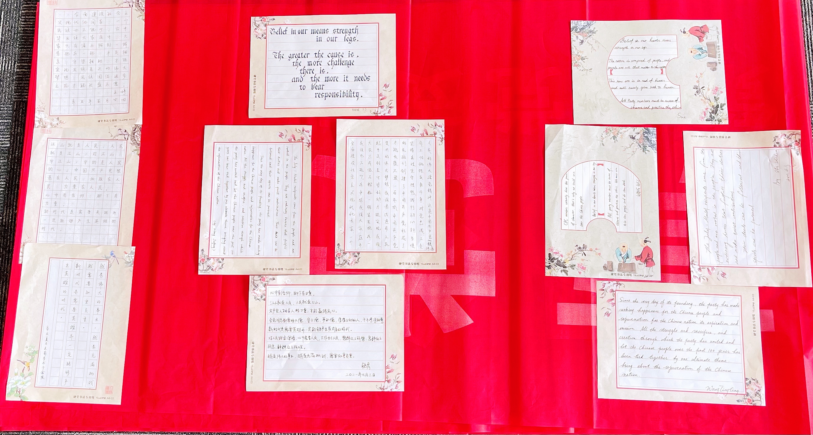 公外教师一支部举行了题为“抄录时代思想,争做‘四有’教师”的书法主题党日活动,全体党员通过抄录习近平总书记重要讲话中的中英金句,切磋书法技艺,领悟伟大精神,凝聚磅礴力量,助力一流建设。