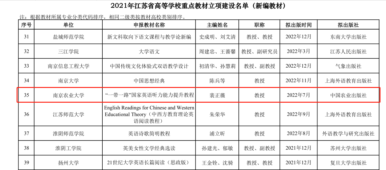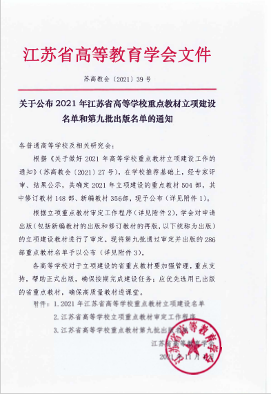 近日,江苏省高等教育学会发布了《关于公布2021年江苏省高等学校重点教材立项建设名单和第九批出版名单的通知》(苏高教会〔2021〕39号),草榴社区