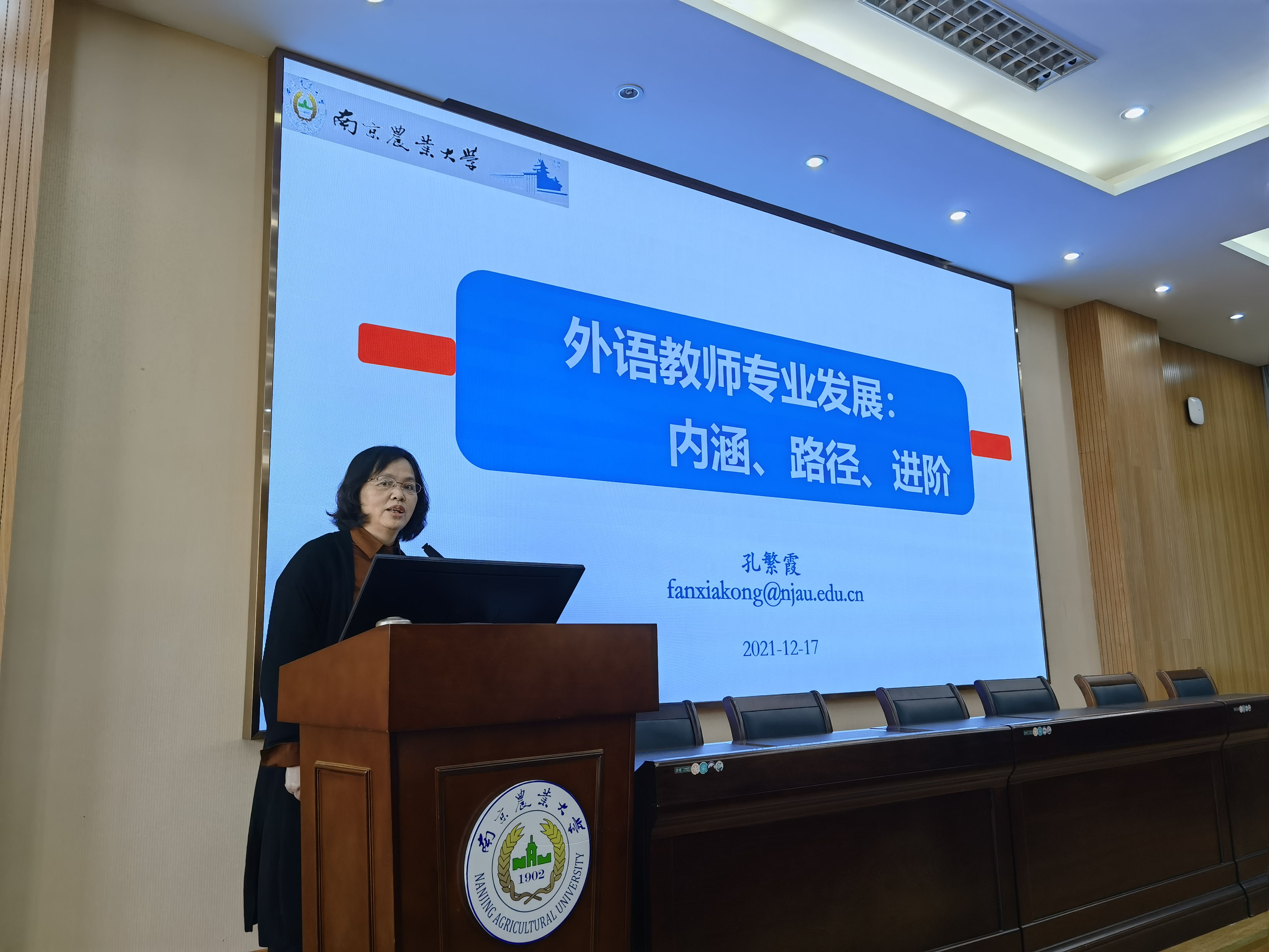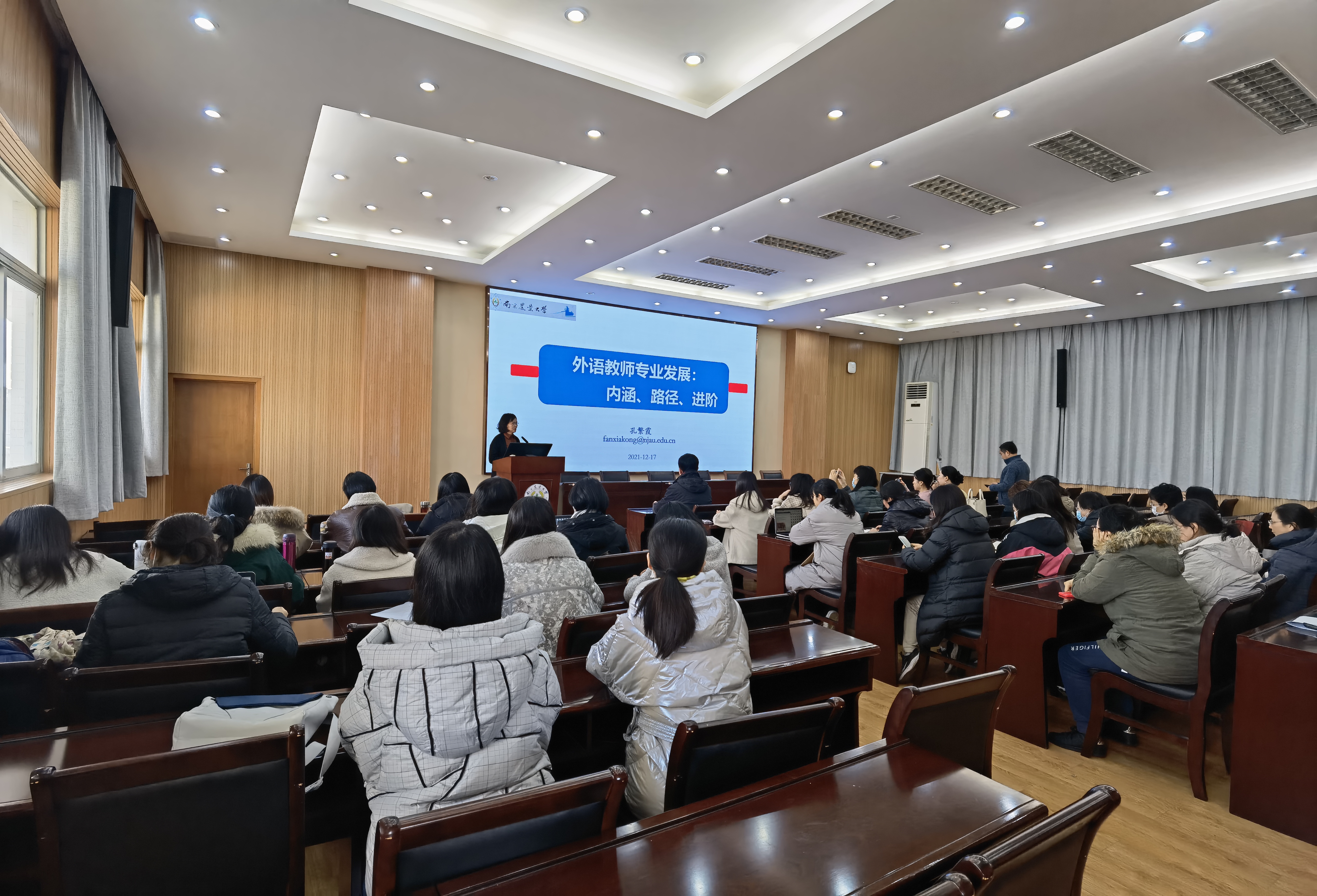 孔繁霞教授近五年主持完成省部级教育教学改革研究课题6项,在CSSCI期刊发表论文以及出版教材和专著共三十余篇(部),在教学研究工作中始终以立德树人、以身施教为原则,四十多学期教学质量评价皆为优秀,先后获得“师德标兵”、“最美教师”、“教学标兵”、“师德先进个人”称号,在教学与科研领域积累了丰富的成果。此次辅导报告会上,孔繁霞教授以《外语教师专业发展:内涵、路径、进阶》为题,从教师发展中的问题、教师发展的内涵建设、教师发展实现路径以及教师发展进阶策略四个方面详细阐释了与教师发展密切相关的方方面面。青年教师们纷纷表示受益匪浅,孔老师的辅导报告帮助他们从理论高度以及实践视角深入对高校教师职业的内涵进行了深入剖析,同时也进一步帮助他们明确了目标和任务,坚定了必胜的信心,增强了奋斗的勇气。