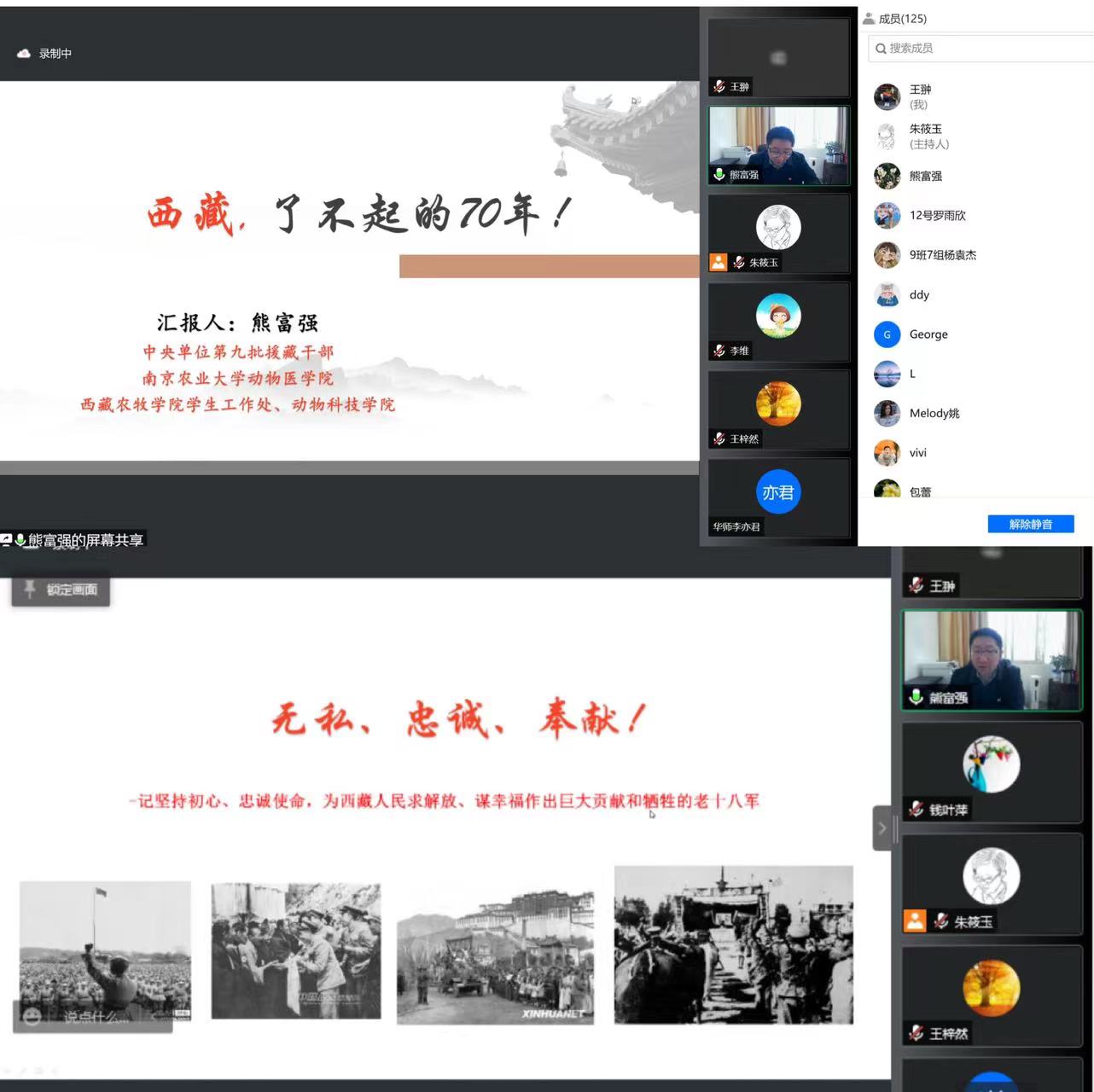 英语教师党支部承办的“尚语-思政大讲堂”邀请了中组部第九批援藏干部,我校动物医学院党委副书记,西藏农牧学院学工处副处长、动物科学学院党委副书记、副院长熊富强为全院师生党员作了题为“西藏,了不起的70年”专题报告,近200名师生在线聆听了报告。报告由学院党委书记朱筱玉主持。