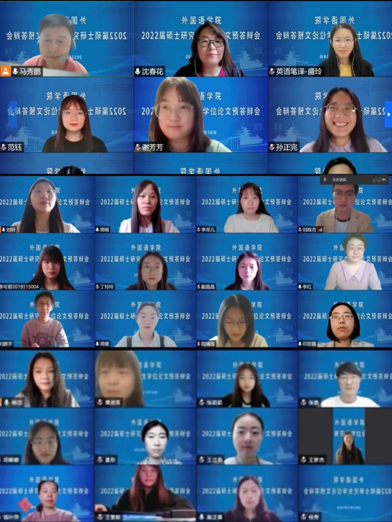 本次预答辩分成七组,采用腾讯会议线上方式进行,预答辩委员会由21名院内导师和教师组成,英语语言文学、日语语言文学、英语笔译和日语笔译专业共56名研究生参加了此次预答辩,部分2020级和2021级研究生观摩了预答辩会。