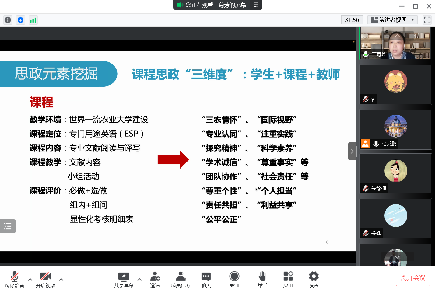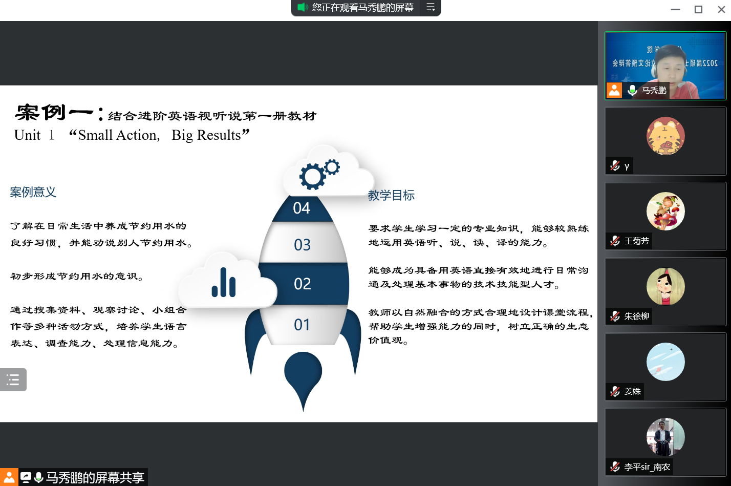 课程思政建设实施方案》等文件要求,通过展示凸显课程思政理念的教学大纲,体现课程思政特点的新教案、新课件,以及蕴含课程思政育人典型教学的案例,从课程思政建设实施方案、项目完成情况、课程思政建设成效及教学反思等方面对项目情况进行了汇报。其中,英语系钱叶萍老师和公外部朱徐柳老师,结合自己负责的课程,讲述了外语教学中课程思政教学设计要点,针对如何挖掘思政元素、如何与外语课堂教学深度融合展开深入分析,被推荐参加校级优秀项目的评选。