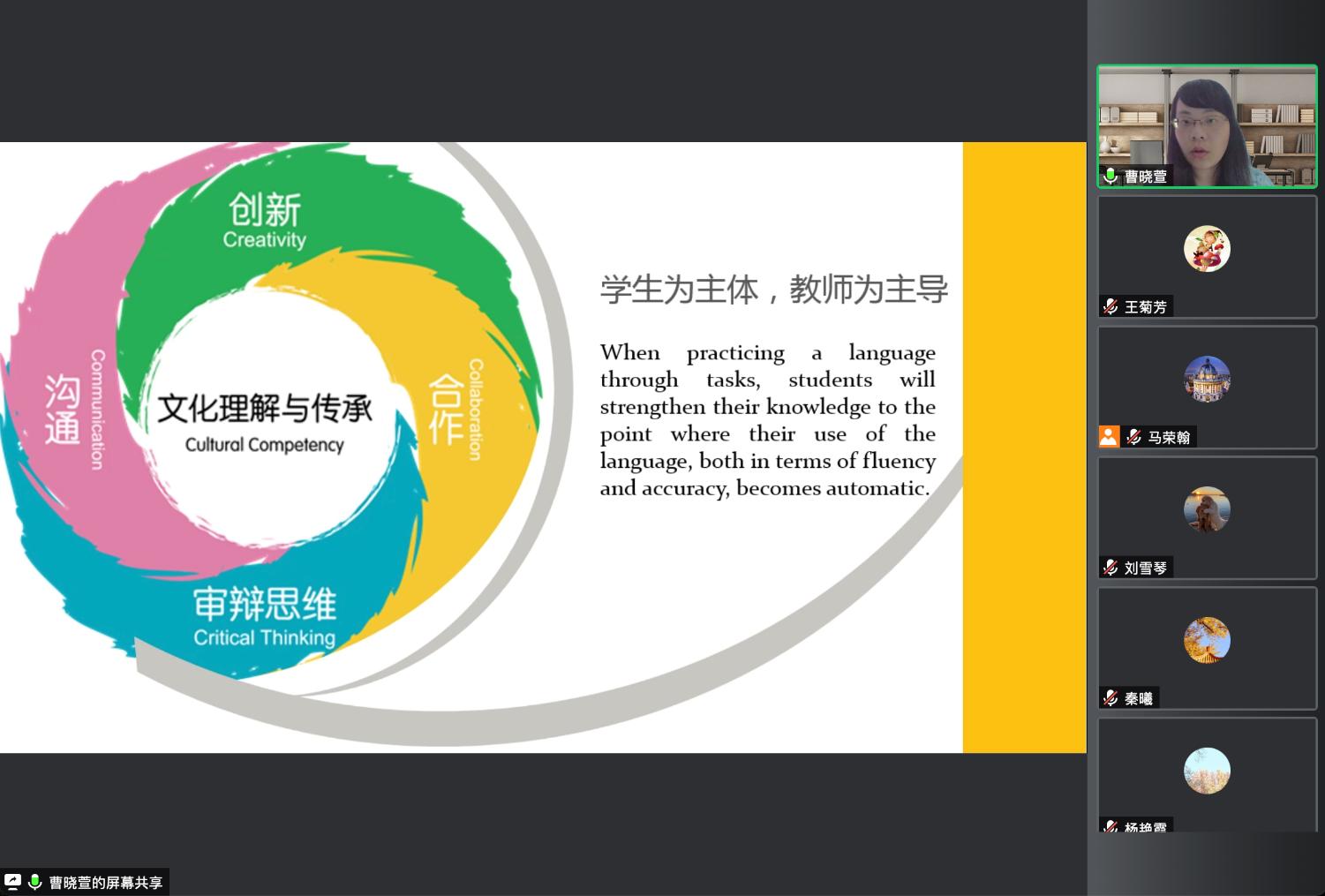 日语系教师刘雪琴、公外部教师曹晓萱分别结合参加学院青年教师授课比赛经历,分享了日常教学经验,从教学思想、教学目标、教学设计等多个角度探讨了推动学生积极学习,提升学生外语能力的途径。公外部教师胡苑艳、朱徐柳分别分享了参加外研社“教学之星”大赛的经历与收获,从教学材料选择、准备比赛过程、现场比赛经验等方面梳理和总结了经验。公外部教师李维在交流中指出,教学是个动态的过程,每位老师都可以通过精心设计、认真准备、积极反思等提升教学质量。王歆、王薇、邓丽霞、秦曦等参与了讨论发言。