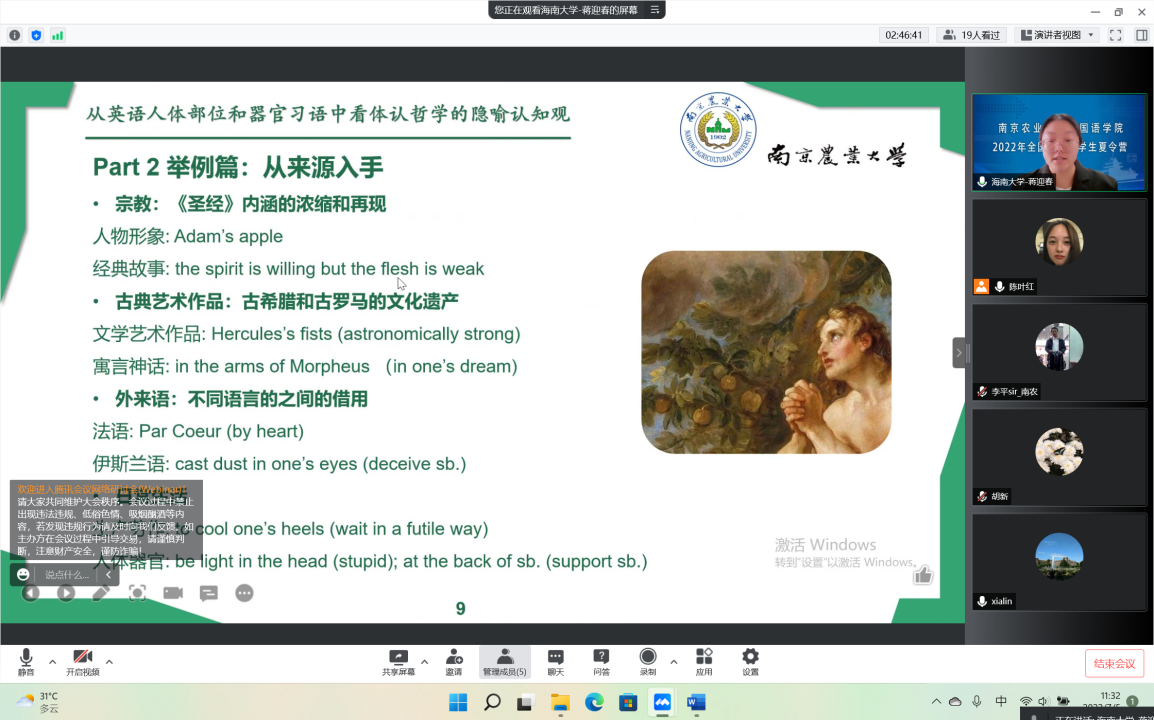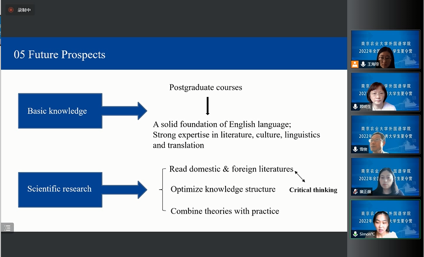 7月5日上午,英语与日语方向的硕士生导师担任评委,对营员进行了分组综合考核。营员们汇报了个人情况并提交了学术论文,回答了评委老师的提问,结合论文的研究内容、研究方法等与老师进一步探讨交流,展现了自己的外语功底、知识储备、学术素养以及书面和口头表达能力。营员们的优秀表现和综合素质,给评委老师留下了深刻印象。