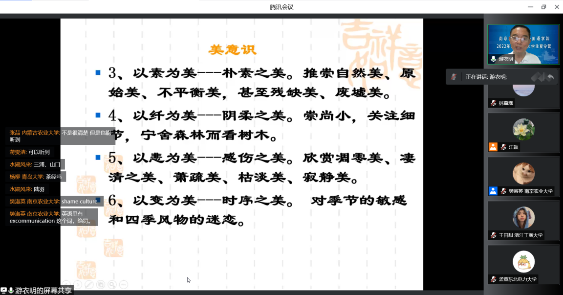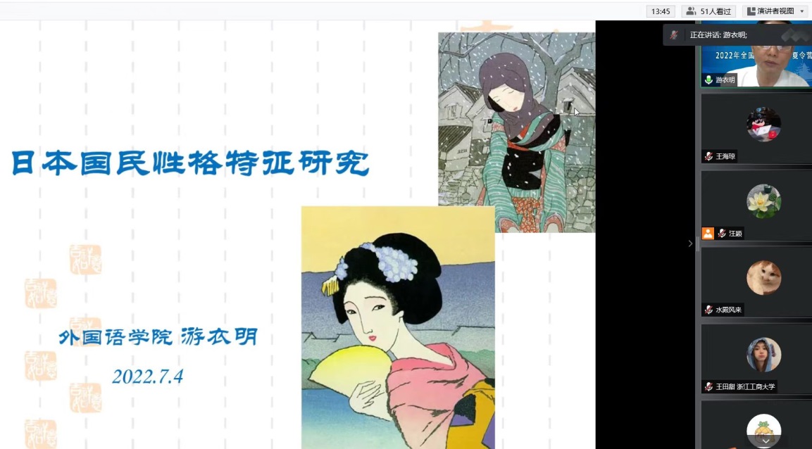 下午,副院长游衣明副教授作了题为“日本国民性格特征研究”的专题讲座。他从日本文字的历史入手,讲解了日本语言文字的发展演变,并以插花、茶道、和服为例,介绍日本的文化艺术,重点讲解日本人的自然观、危机感、集团归属意识、等级序列与能力平等主义、“耻感”文化、守礼以及美意识。他还针对营员们提出的问题进行了深入解答。讲座由樊淑英副教授主持。