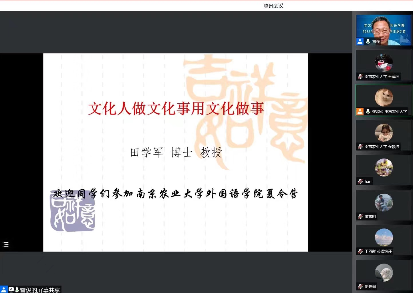 开营仪式后,田学军教授作了题为“文化人做文化事 用文化做事”的专题讲座。他从文化、文化人、做文化事以及用文化做事四个方面进行详细阐述。他指出,文化是一个可大可小、能深能浅、有形无形、贯穿历史、活跃当下的可变概念,其关涉的方面众多。他指出,我们应成为有知识、有涵养、有思想(能够做文化事、用文化做事)的人,从文化管理、文化原创、文化样类、文化研究、文化传播、文化设施等方面“做文化事”;通过“文化观察-文化积累-文化学研-文化传播”实现“文化人做文化事,用文化做事”。在互动环节,他还细致解答了同学们提出的问题。