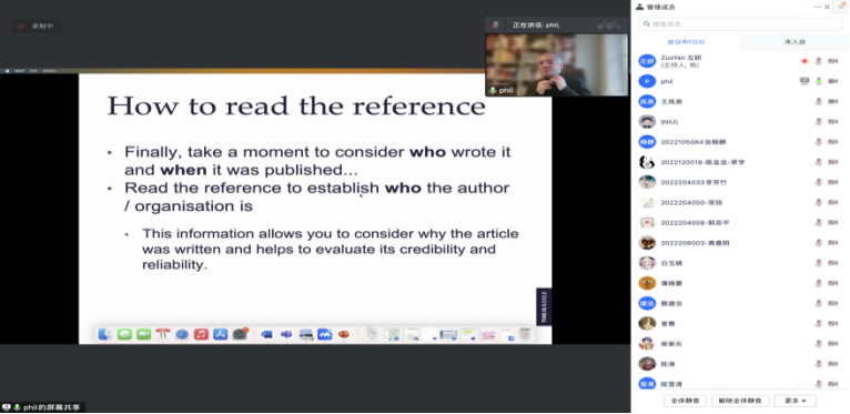 讲座探讨了后疫情时期高校在课程国际化过程中所面临的机遇与挑战,介绍了英国高校通过了解学生需求和创建特色课程来提高学生对学科的认识,培养他们将专业能力转化为就业能力、跨文化能力和团队合作能力;介绍了英国国内课程国际化的最新进展,讨论了基于合作关系的教育模式——本着互惠互利的原则的潜力,这种模式支持与其他国家合作进行线上和线下教学,使每所高校和学生群体得以相互学习。讲座还讨论了提升学生学术能力的关键策略与技巧,分享了采用何种技术来确保有效地进行现场会议记录,如何确保学生有效地独立完成学术阅读,并分析了学术写作和学术风格的特点等。