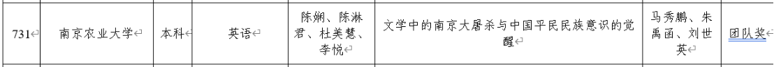 英美文学团队(马秀鹏、朱禹函、刘世英)指导学生陈娴、陈淋君、杜美慧、李悦完成团队毕业论文《文学中的南京大屠杀与中国平民民族意识的觉醒》,荣获省级优秀团队毕业论文(设计)。