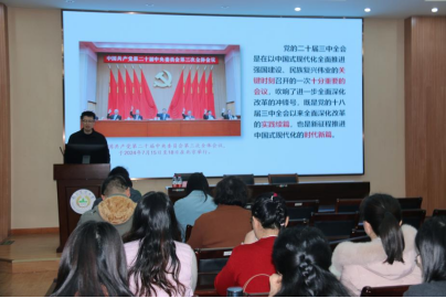邀请党的二十届三中全会宣讲团成员,马克思主义学院青年教师王欢博士做题为《进一步全面深化改革推进中国式现代化》专题报告。宣讲会由学院党委书记董红梅主持,学院班子成员、学院全体教职工和学生党员参加了宣讲会。