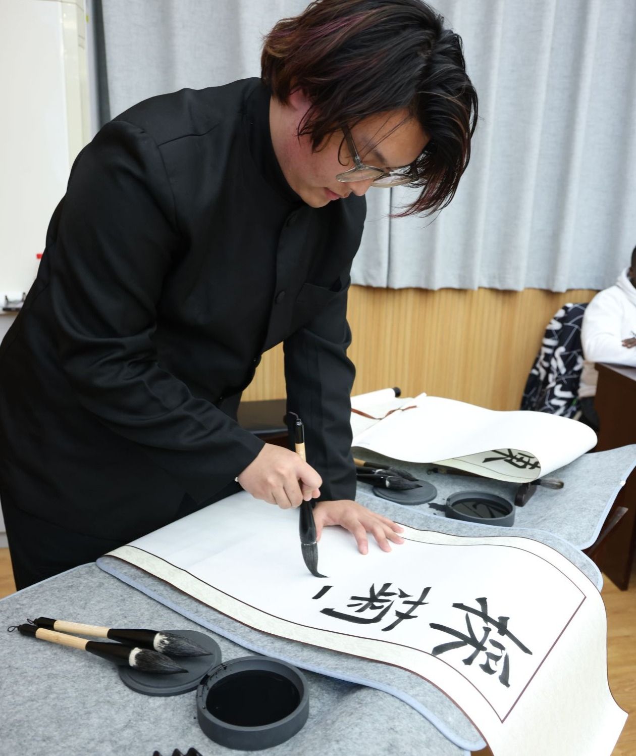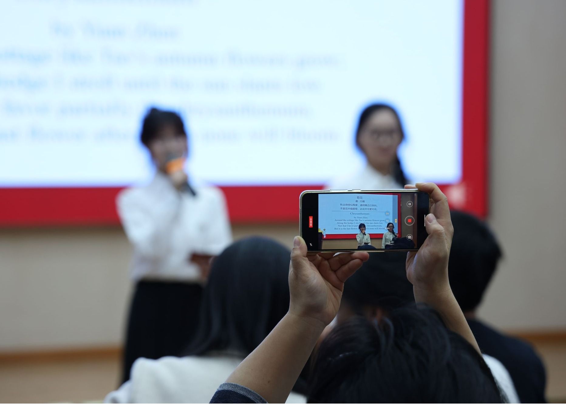 师生们依次介绍了菊花的植物属性、品种变迁,通过诵读与讲解菊花在中国古代诗词中传达的内涵和情感,现场用书法书写经典的菊花诗词,生动展现菊花所传递的精神力量。