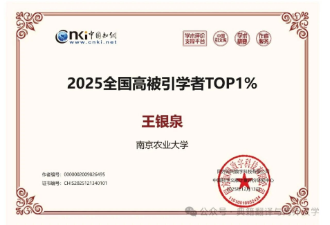 王银泉教授再度入选外国语言文学一级学科高被引学者Top1%名单,这是他继2024年首次入选后的再度上榜,标志着其学术影响力获得学界持续认可。