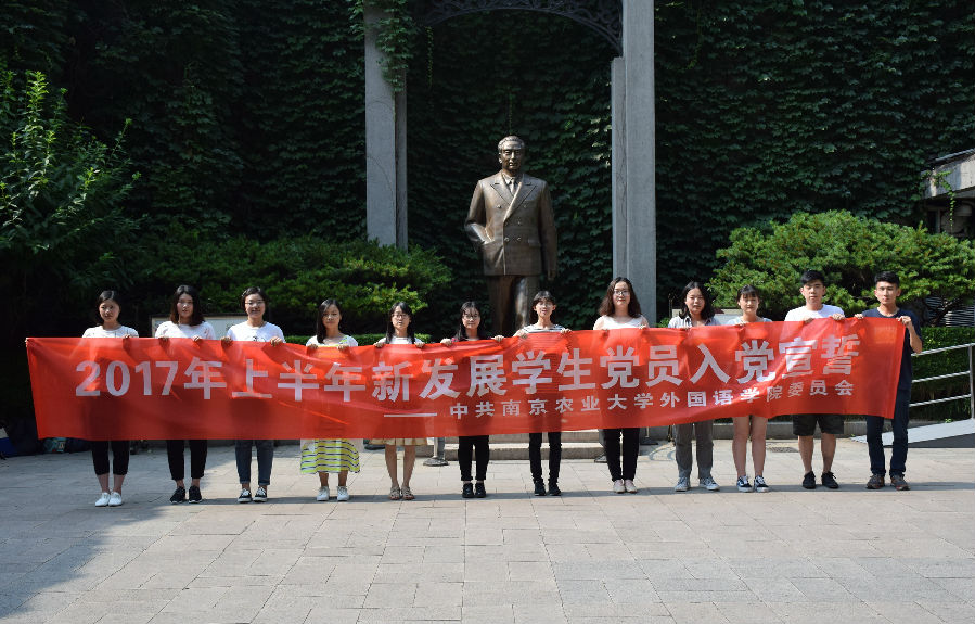 参观过后,入党宣誓仪式于梅园新村正门周恩来铜像前举行,宣誓仪式由党建班班长李佳佳主持。宣誓仪式第一项,奏《国际歌》。随后仪式进入第二项,由党建班组织策划部部长林楠宣读参加宣誓的党员名单。仪式第三项,由肖明慧同志领读誓词,12位党员同志共举右拳,面向党旗,庄严宣誓。仪式第四项,新党员代表刘玉洁同志发言,她表示作为一名新党员,要明确党员义务,不仅要从组织上入党,更要从行动上入党。仪式第五项,辅导员贾琼总结发言。她首先对12位党员同志加入党组织表示祝贺,接着对于加强理论学习、参加党内活动、保持党组织凝聚力等方面提出要求,表达殷切期望。仪式最后一项,奏《中华人民共和国国歌》。入党宣誓仪式在庄严肃穆的气氛中进入尾声。