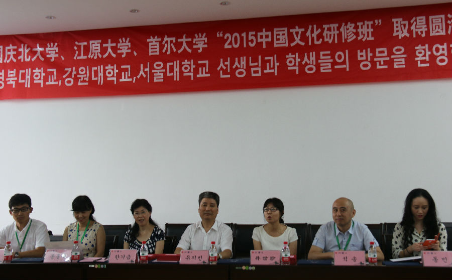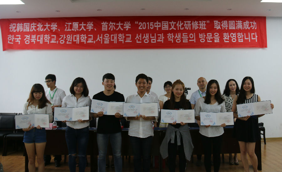 2015年7月22日下午两点,韩国庆北大学、首尔大学、江原大学“2015暑期研修班”结业典礼暨中韩学生联欢会在教学楼七楼报告厅举行。国际教育学院院长刘志民,草榴社区