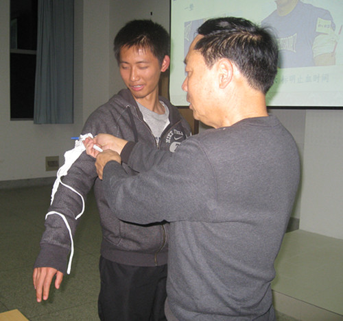 为提高在校大学生对于日常生活中突发疾病及事故的应对能力,我校红十字会为全校大一新生进行了急救培训,并在现场进行急救示范。