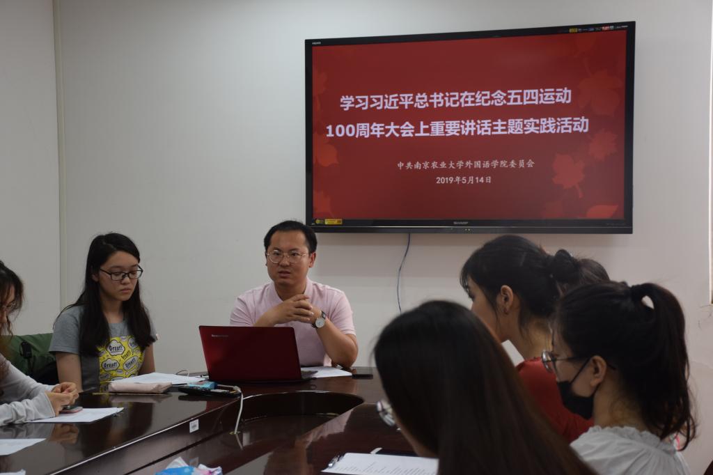 新发展党员在教学楼E302举行开展“学习习近平总书记在纪念五四运动100周年大会上重要讲话”主题实践活动,重温“五四精神”。辅导员甄亚乐及2018年下半年新发展党员参加了学习活动,活动由英语本科生支部副书记张睿杰同志主持。