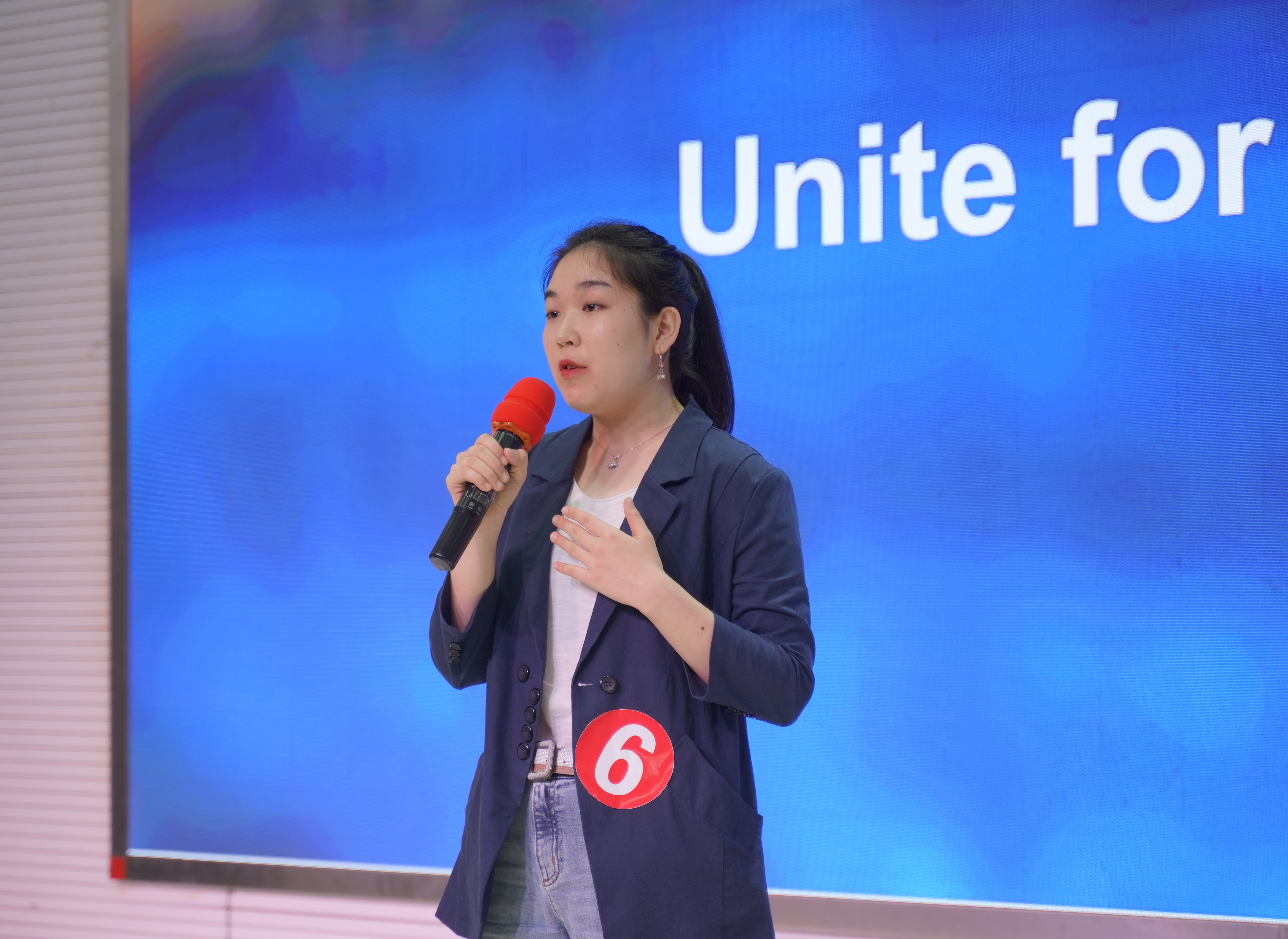 决赛分为定题演讲和即兴演讲两轮。第一轮定题演讲的主题为Challenge to all,每位选手演讲完毕后由评委老师就演讲内容进行提问并打分,排名前五名的选手进入第二轮即兴演讲。定题演讲结束后,霍雨佳从语音、姿态、眼神、临场表现等方面进行点评,并针对选手的表现提出建议。最终,刘颖希、周慧洋、赵瑜涵、陶冶、王圆五位同学进入决赛。