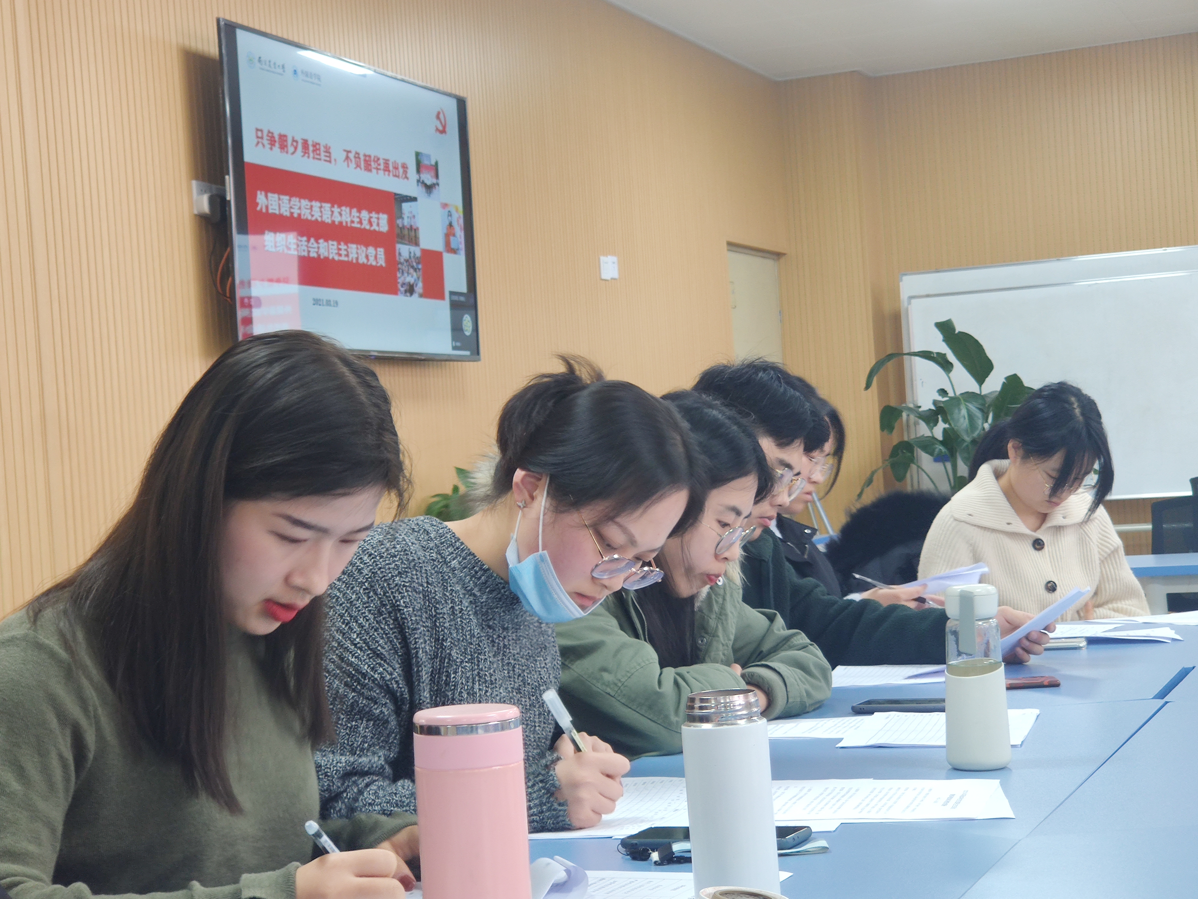 英语本科生党支部在教学楼A621组织召开了组织生活会和民主评议党员。英语本科生党支部全体党员参加了此次会议。鉴于部分党员暂未返校,本次会议通过线上腾讯会议和线下会议的形式同时召开。会议由英语本科生党支部书记甄亚乐主持。