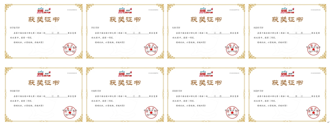 2021年7月12日,第十届全国口译大赛(英语)江苏省复赛结果公布,我校晋级的25名同学中,英语192班的徐子璇、开欣和英语181班的杜典获一等奖,英语192朱韵琦、英语193李欣朦、英语181付俊熙、英语182邱田原和英语16级张园梦获二等奖,共计8名同学晋级华东大区赛。另有昌伦越、范丽濛等13位同学获得三等奖。本次比赛的领队为翻译教学团队的霍雨佳老师,负责选手的报名与培训工作。